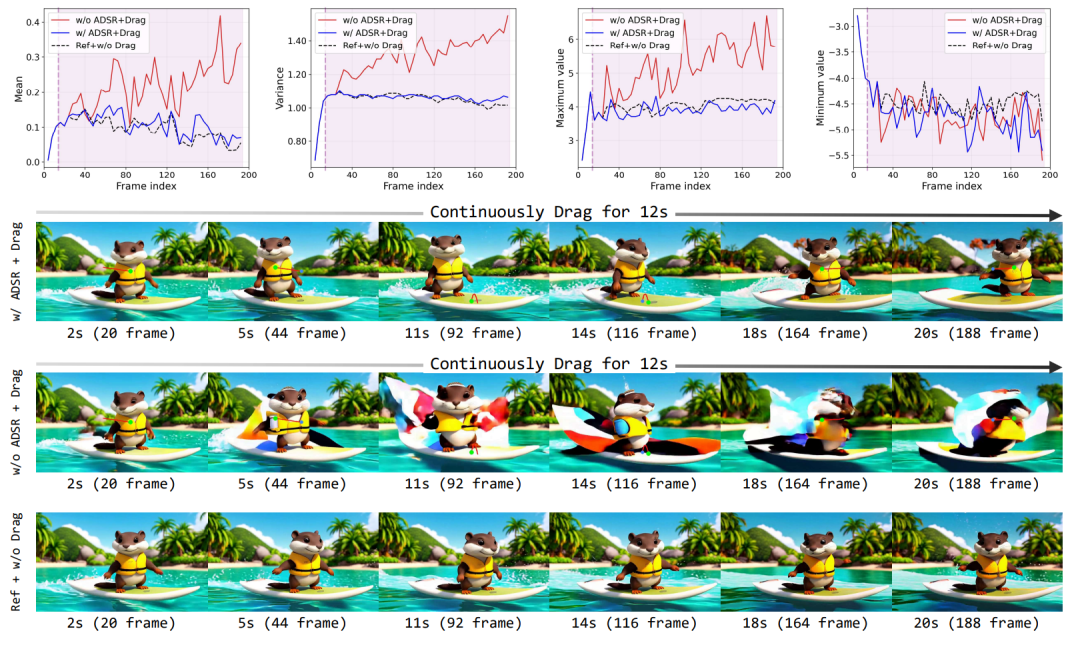 图 2:隐分布漂移挑战与 ADSR 效果对比。第一行展示了拖拽操作后隐编码均值、方差、极值的剧烈波动;无 ADSR 策略时,隐分布严重漂移,拖拽过程中断,物体属性出现异常;加入 ADSR 后,分布漂移被有效抑制,拖拽过程稳定,画面内容保持正常