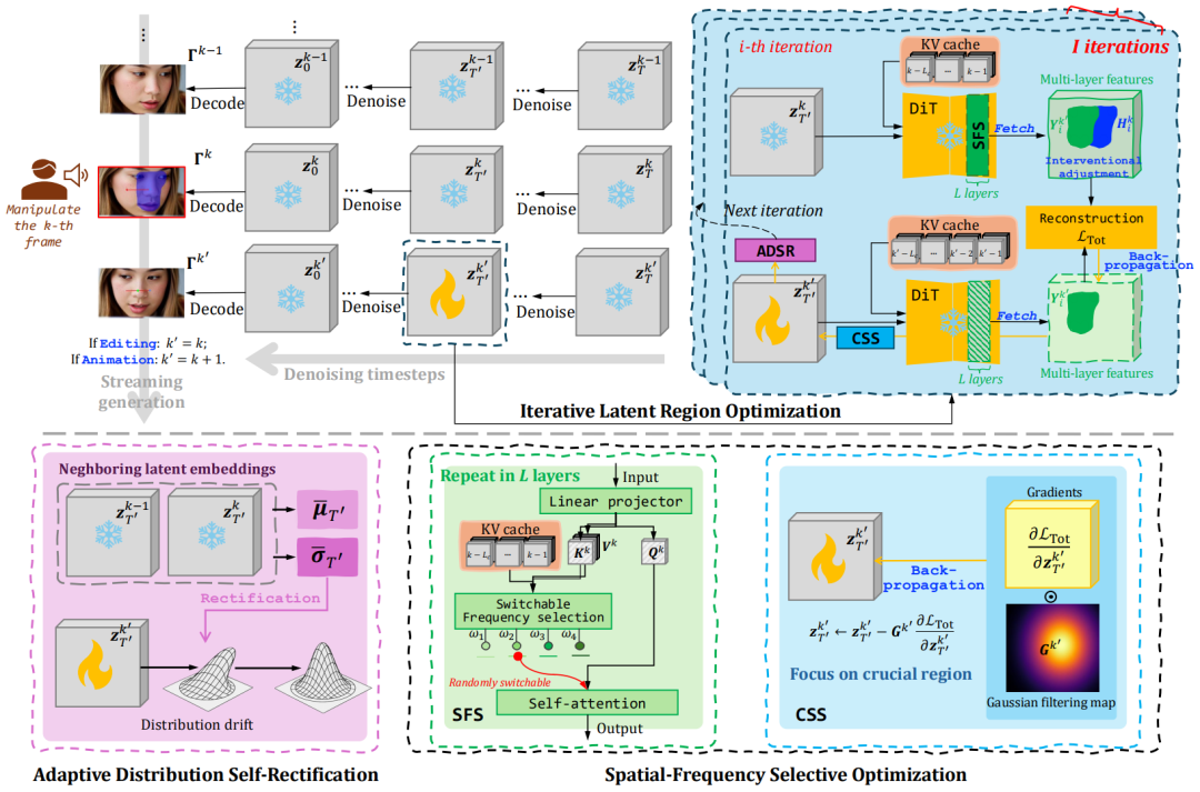 图 4:DragStream 整体技术管线示意图。完整呈现了从用户输入拖拽指令,到隐编码迭代优化,再到 ADSR 分布校正、SFSO 空频选择性优化,最终输出修改后视频帧的全流程