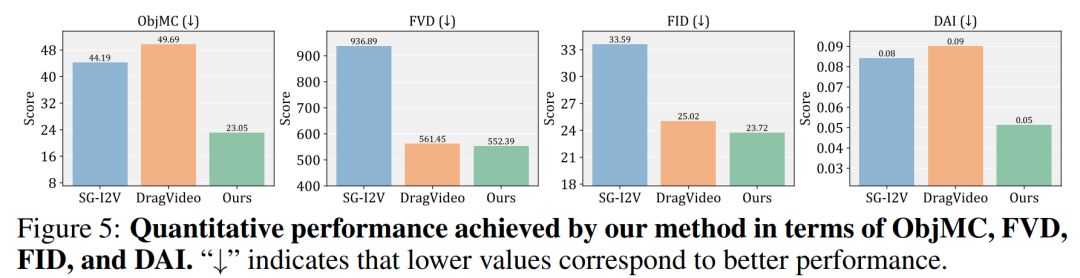 图6:DragStream与SOTA方法的量化指标对比。直观呈现该方法在 ObjMC、DAI、FVD、FID 四大核心指标上,均全面领先DragVideo与SG-I2V